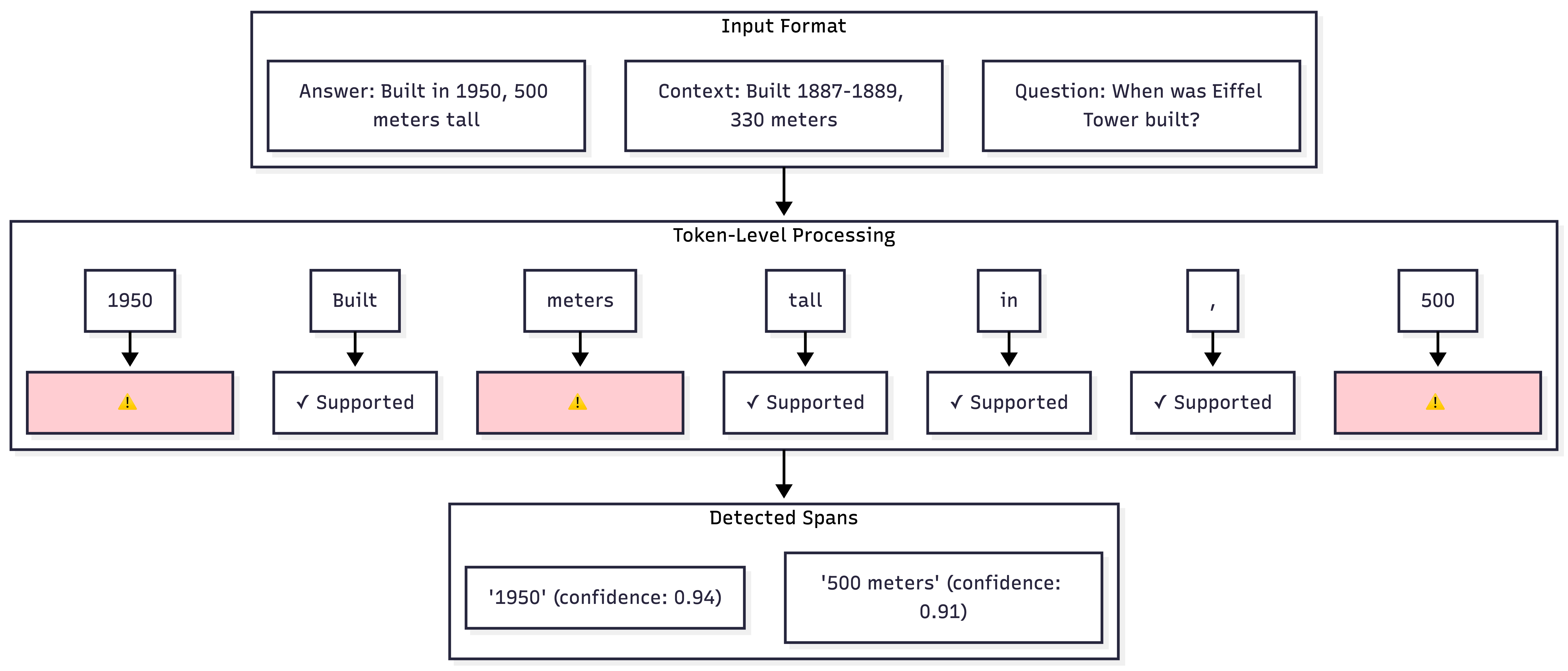 Unlike sentence-level classifiers that output a single “hallucinated/not hallucinated” label, token-level detection identifies exactly which tokens are unsupported by the context.